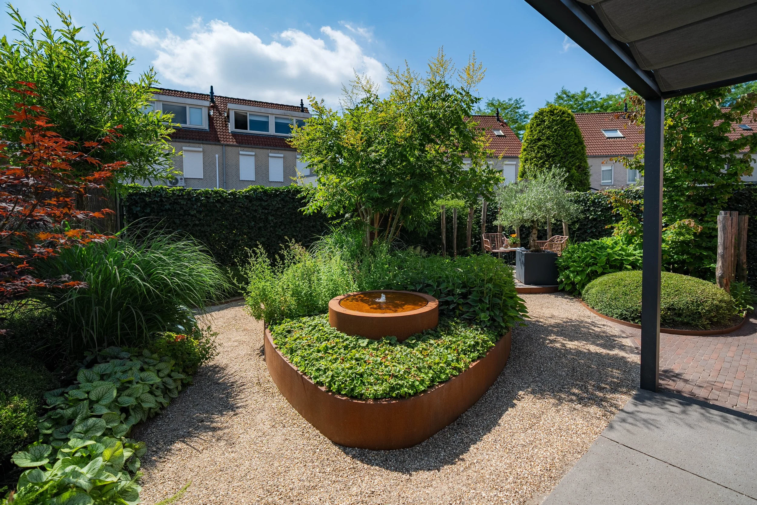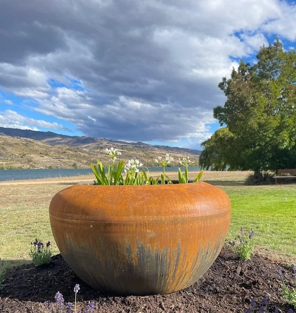 In Wānaka, the Archipello. Onyx planter in Corten steel has been effectively used to create an organic-form focal point within the expansive lifestyle garden.
