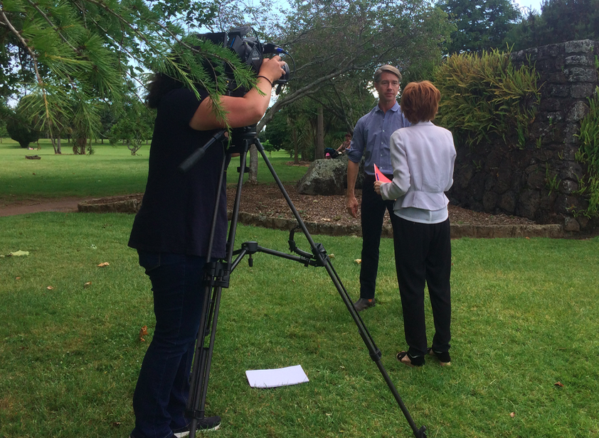 Thomas watches on as we interview Boffa Miskell's Rachel de Lambert about their joint Cornwall Park 100 year Masterplan.