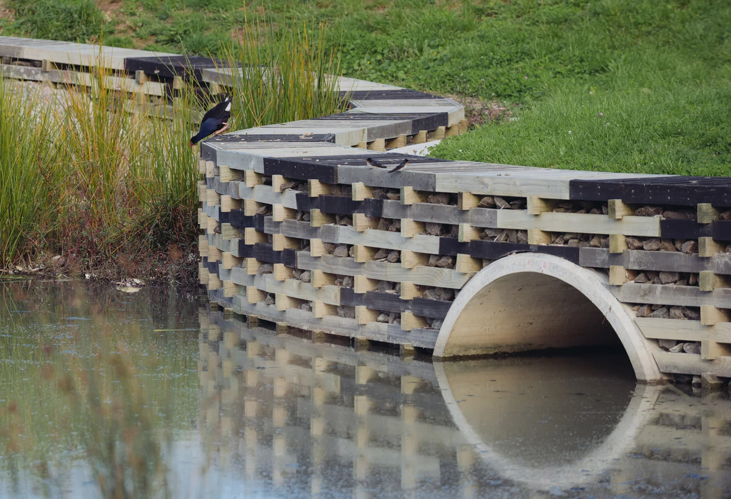 The ponds provide an arrival experience into the town centre and one of the crib walls forms a gateway across a road, also acknowledging the stream that runs beneath.