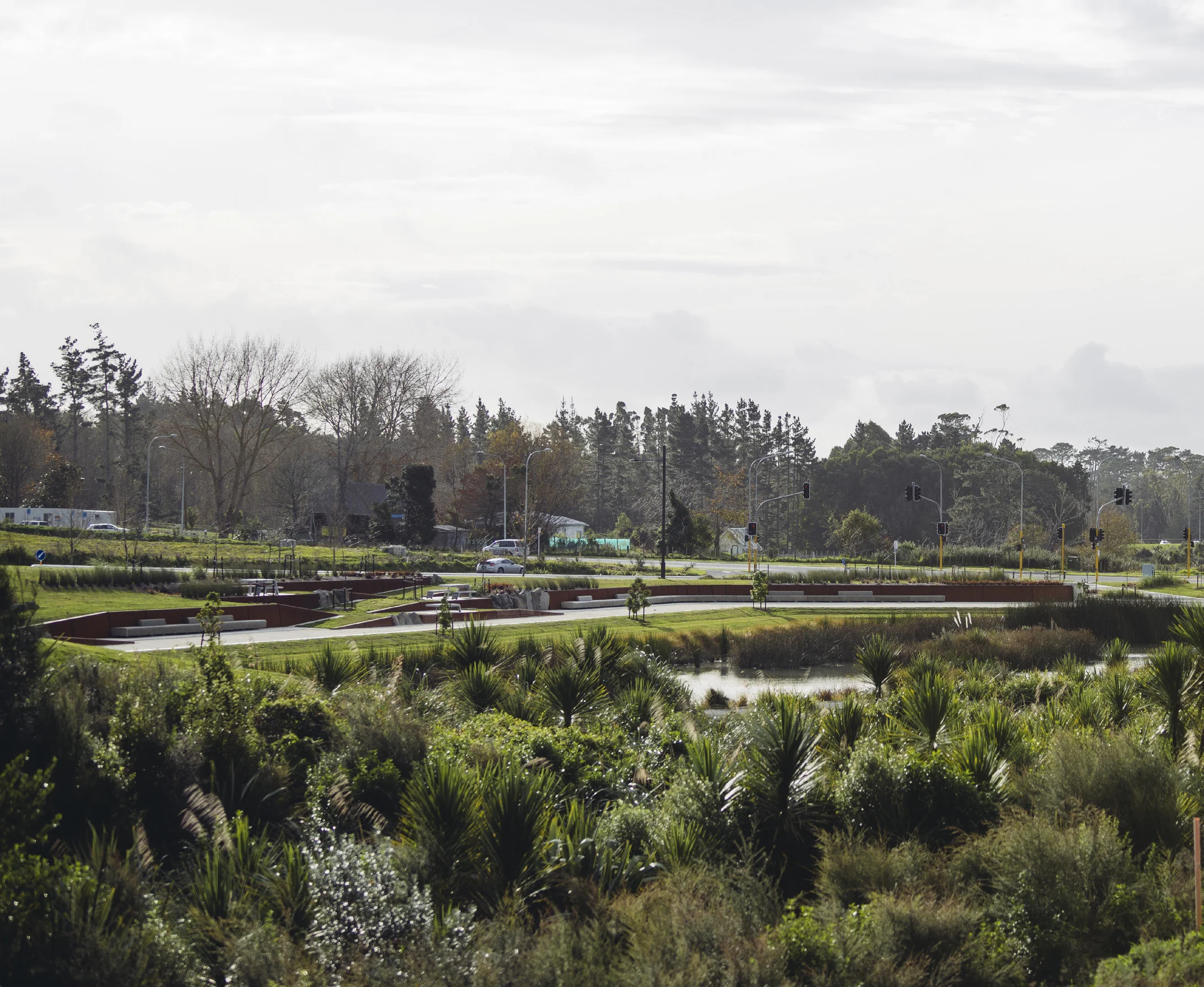 These striking, sculpted structures integrate the stormwater ponds with the open space and will provide areas for a skate park, cultural garden (showcasing Māori weaving plants) and play space, contributing to an interesting and varied open space experience.