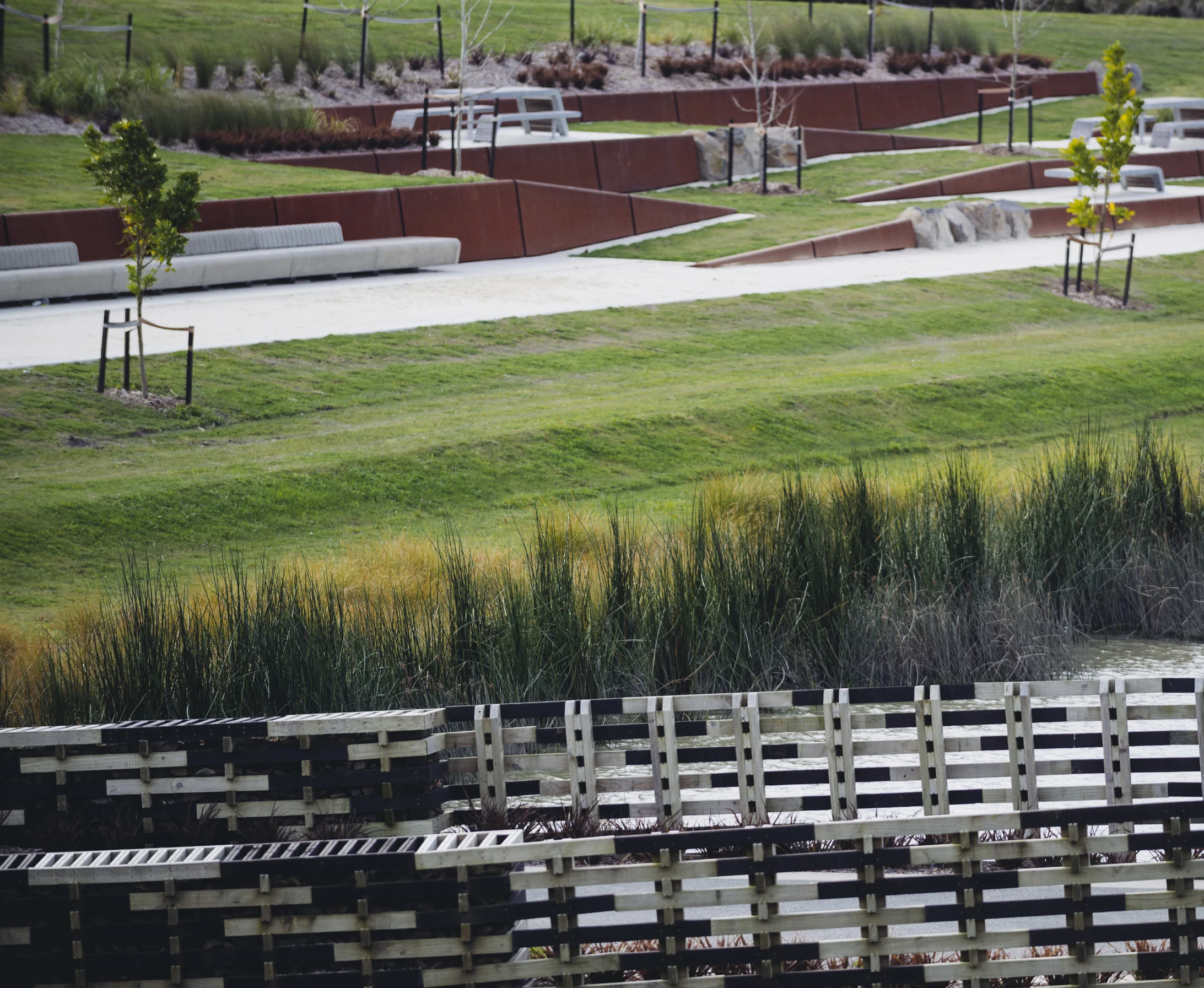Crib retaining walls, rather than being separate elements, perform both as engineering structures that support the infrastructure behind them, and as spaces for people above and within the structures. Made from treated pine timber and filled with rock – both of which were locally sourced – the walls are permeable structures that help to filter the water and can flex and move as the land expands and shrinks. Over time the structures will become part of the park’s ecology. They are also land bridges and provide spaces for public amenity. A bold aesthetic for the crib walls echoes the scale of the adjacent Westgate town complex, and references Maori weaving and rope-making motifs. The weaving design forms a visual warp and weft throughout the site along with other natural and constructed elements – water, planting and cycle ways.