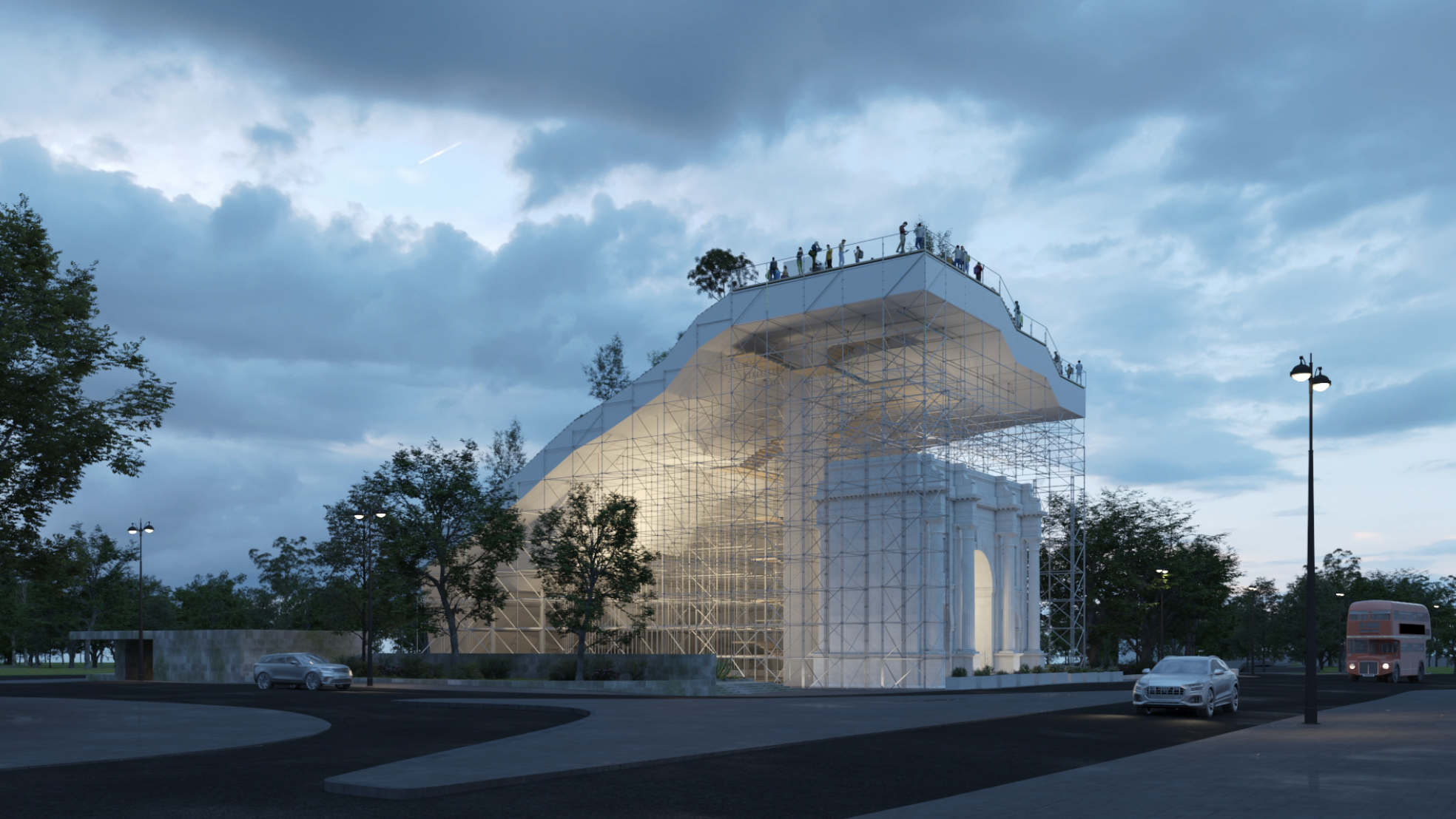 The original design embraced the Marble Arch itself, with a protective, 25-metre-high roofscape and an internal staircase that would allow visitors to see the monument in a way they never could before. Render: MVRDV